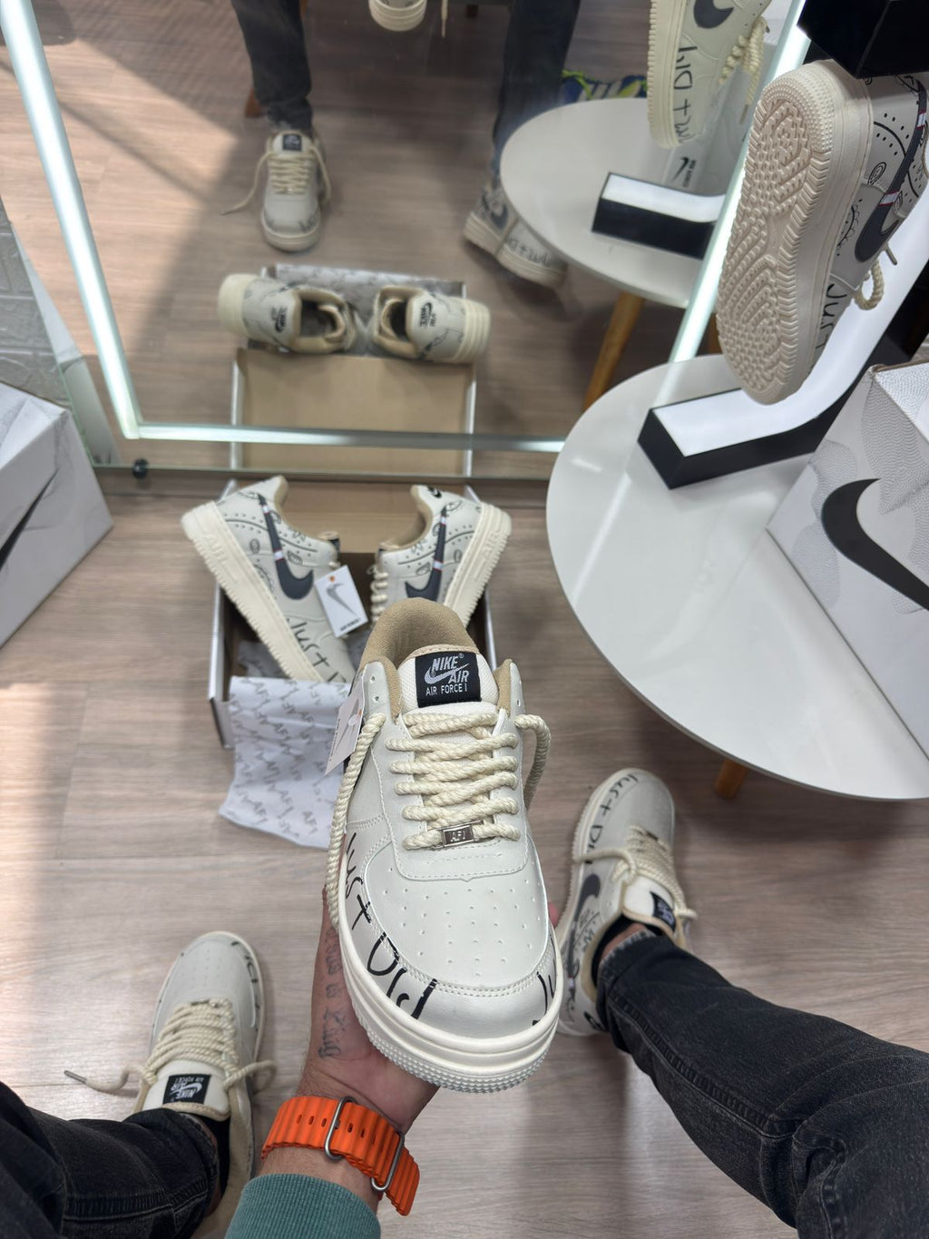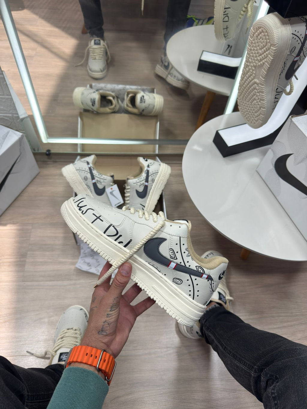 Com base off white sofisticada, grafismos “Just Do It” aplicados no cabedal e o Swoosh em contraste, essa versão premium transforma o tradicional Air Force em uma peça de destaque. Ideal para quem busca autenticidade e um visual marcante sem perder versatilidade.